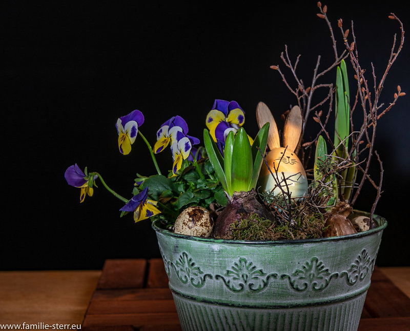 österliches Blumengesteck in einem Blechtopf