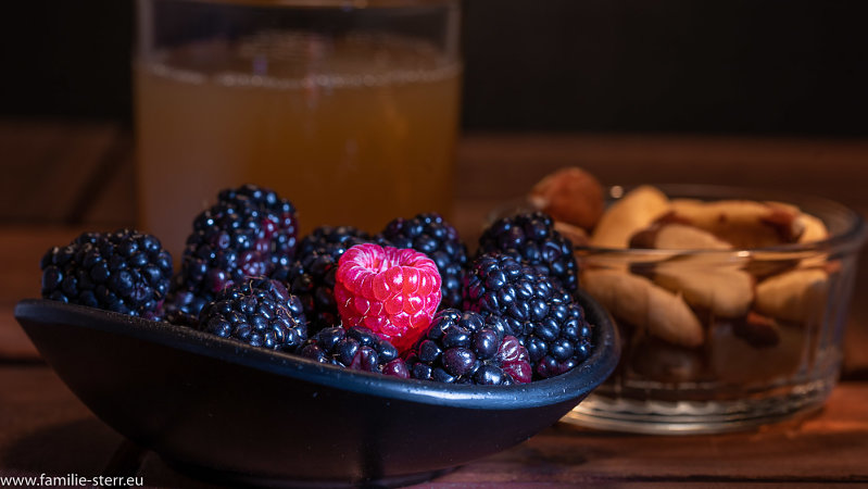 Brombeeren, Himbeere, Paranüsse und ein Apfelsaft