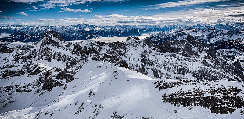 Blick vom Säntisgipfel über den Walensee in die verschneiten Berge